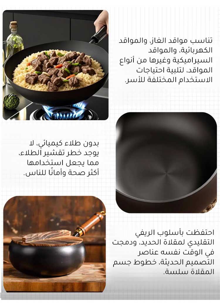 مقلاة ووك لا تحتاج إلى زيت ولا تلتصق. مصنوعة يدويًا على يد حرفيين يابانيين، وزنها أقل من كيلوغرام واحد. مصنوعة من حديد نقي معتمد من المعهد الياباني للمعادن، خالية من الطلاء الكيميائي، تُغذي الحديد، تُساعد في علاج فقر الدم، وتتميز بموصلية حرارية ممتازة، مما يُقصر وقت الطهي مع الحفاظ على القيمة الغذائية والنكهة. لزيادة مبيعات علامتنا التجارية، نُقدم عرضًا ترويجيًا بنصف السعر لفترة محدودة. متبقي 216 وحدة فقط في المخزون، فلا تفوتها.